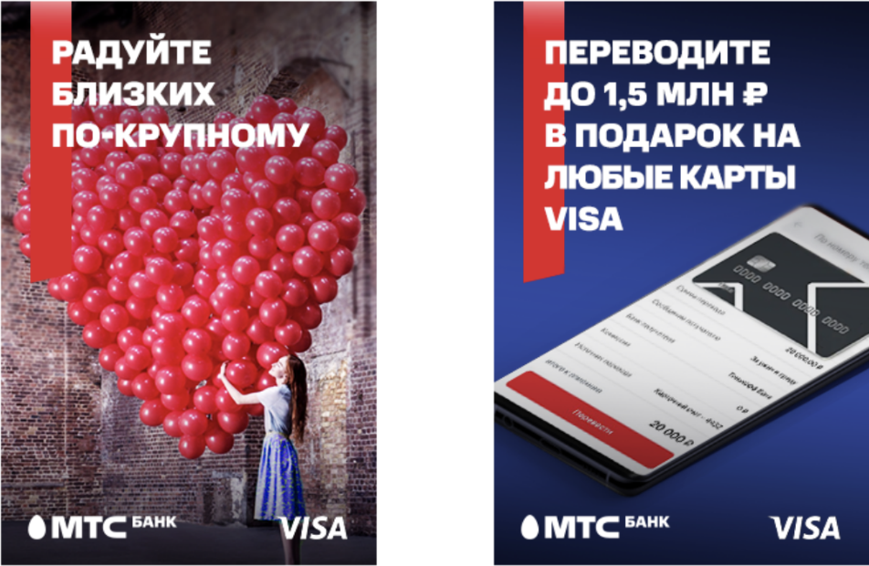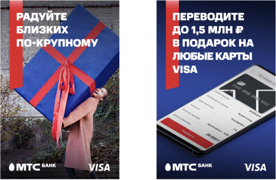 1.2. Мы хотим, чтобы наши близкие получали максимум эмоций от подарков. Поэтому в МТС Банке можно делать большие переводы до 1,5 млн ₽ в день на любые карты Visa и радовать близких по-крупному